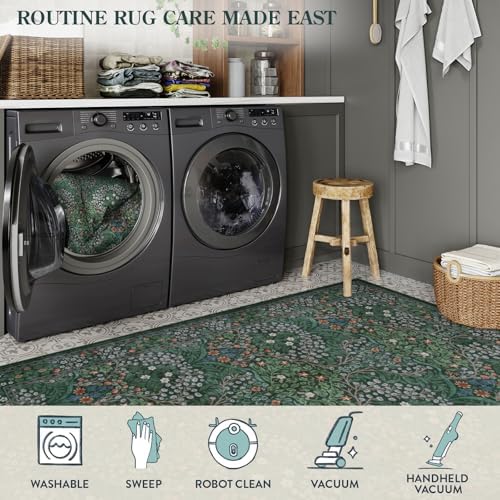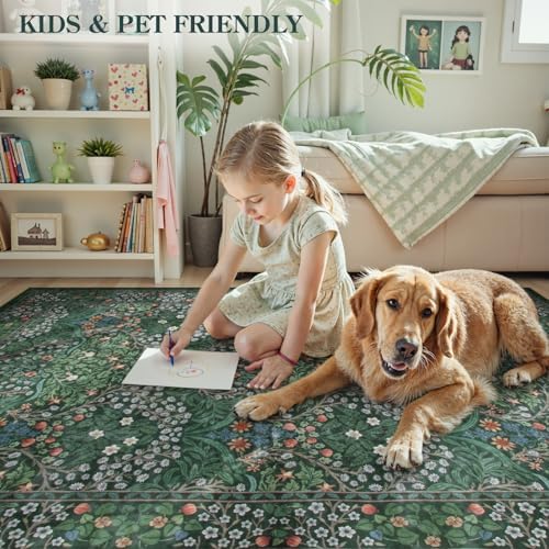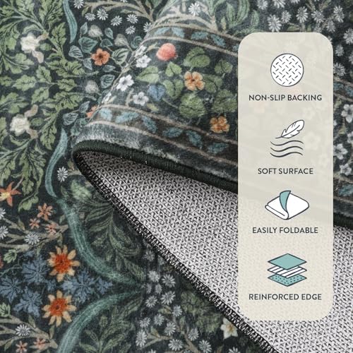 Lahome Floral Washable Rugs 5×7, Soft Green Rugs for Bedroom Living Room, Boho Non Slip Low Pile Forest Stain Resistance Large Throw Carpet for Farmhouse Dining Room Office, Dark Green